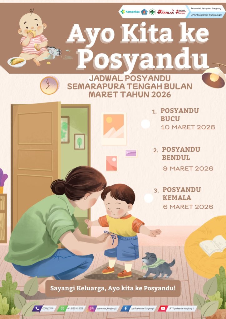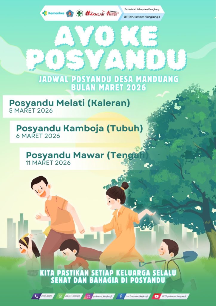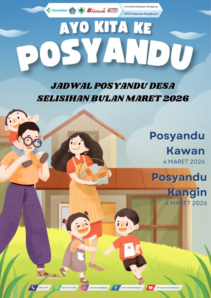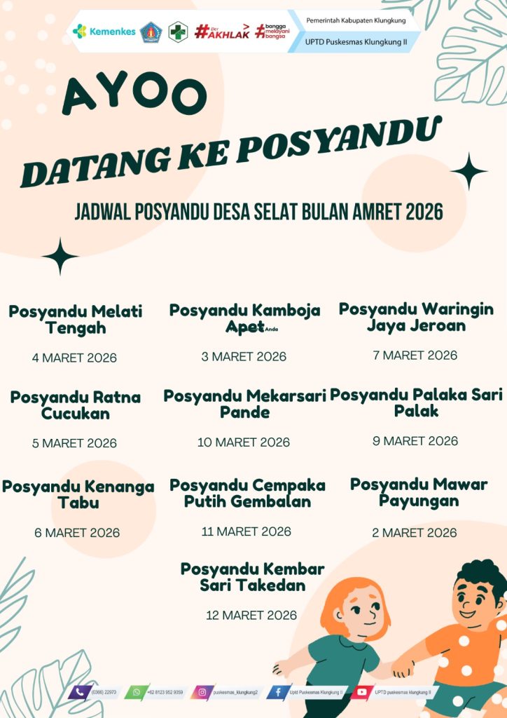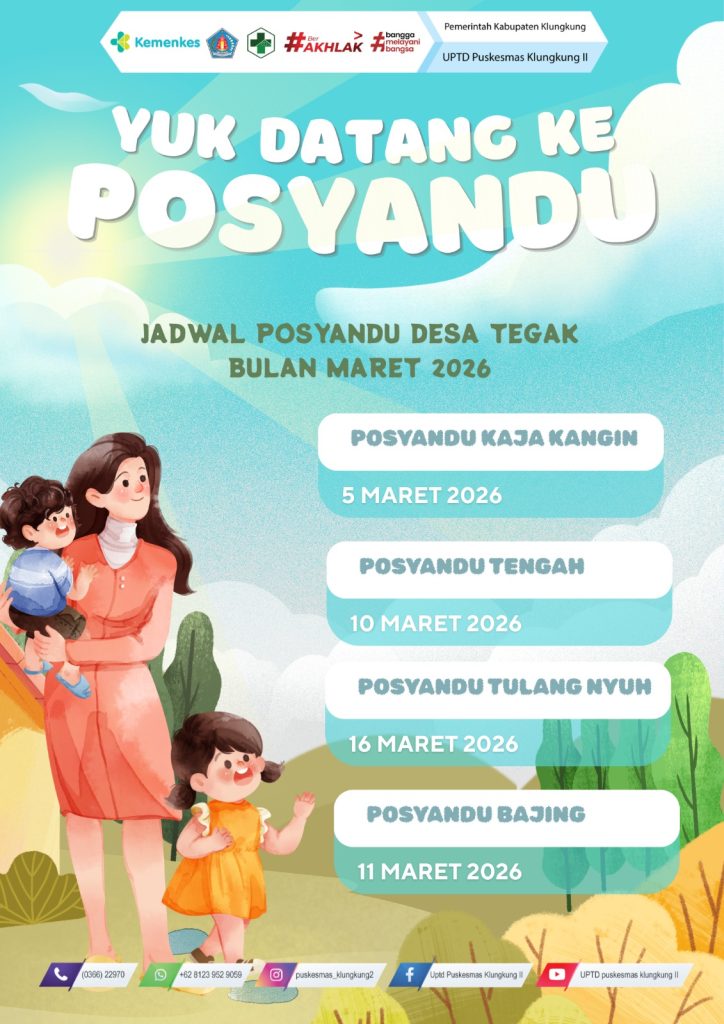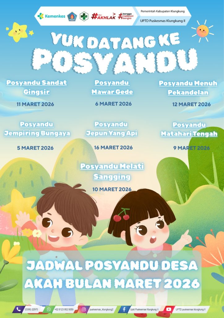 JADWAL KEGIATAN POSYANDU UPTD. PUSKESMAS KLUNGKUNG II 09/03/202605/03/2026 oleh Admin Puskesmas Jadwal Posyandu Puskesmas Klungkung II Tahun 2026 Ayo Datang ke Posyandu! Desa Tegak Desa Akah Semarapura Tengah Desa Manduang Desa Selisihan Desa Selat